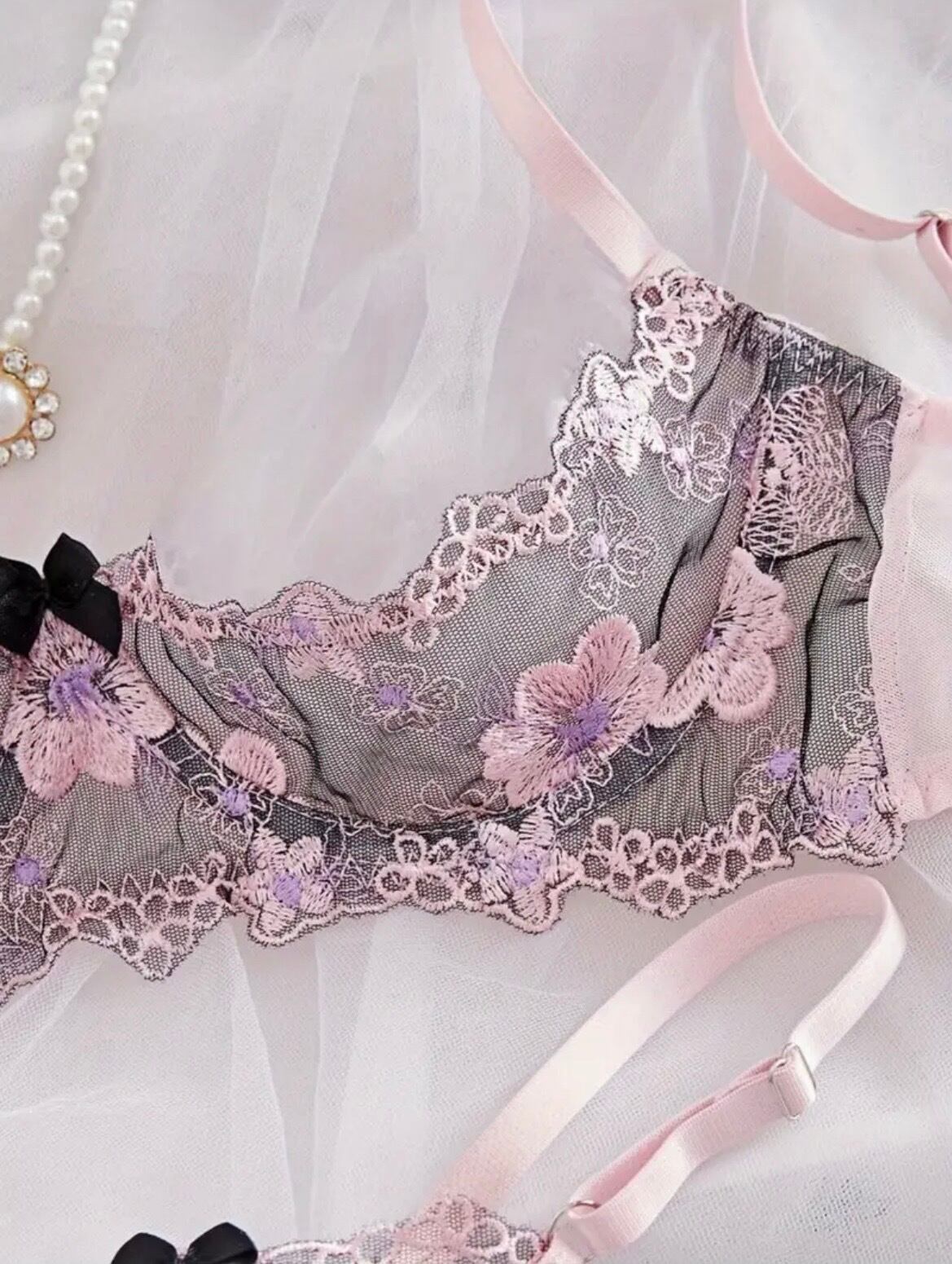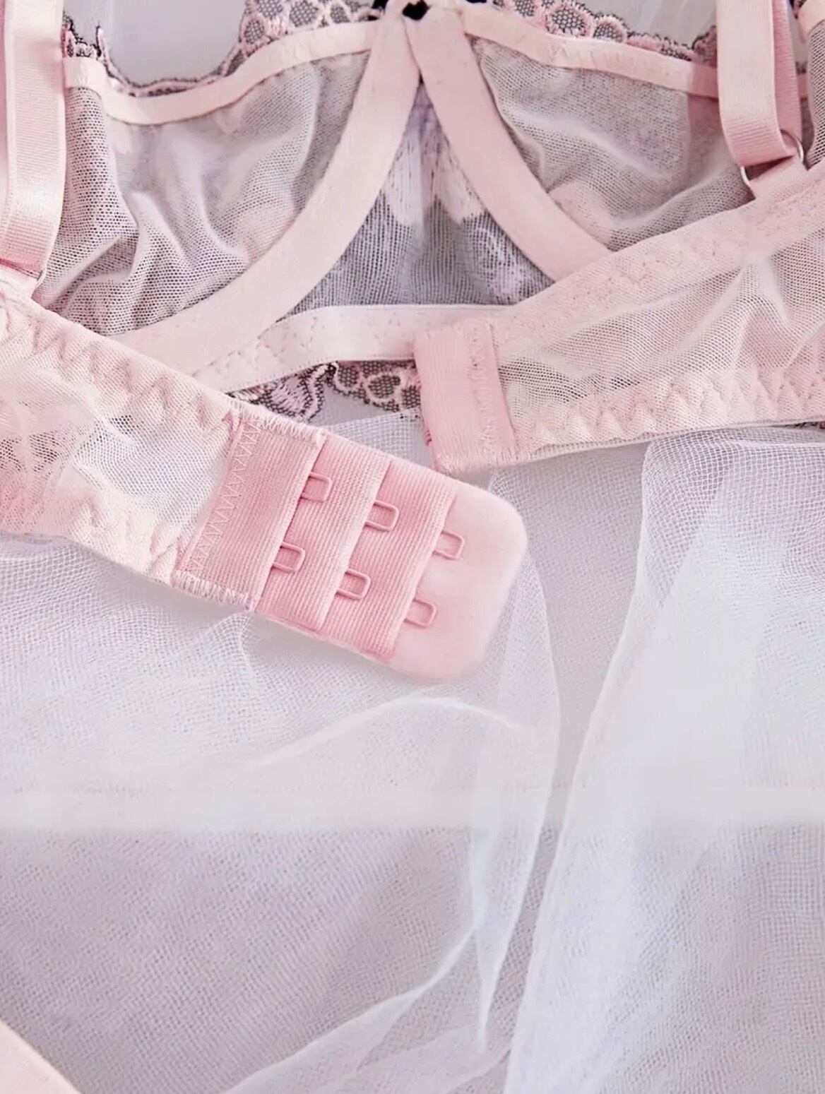 バストを支える柔らかなピンクのストラップと、バックの3段ホックで安定感のある着心地を実現。繊細なレースの透け感が、あなたの肌をより美しく引き立てます。