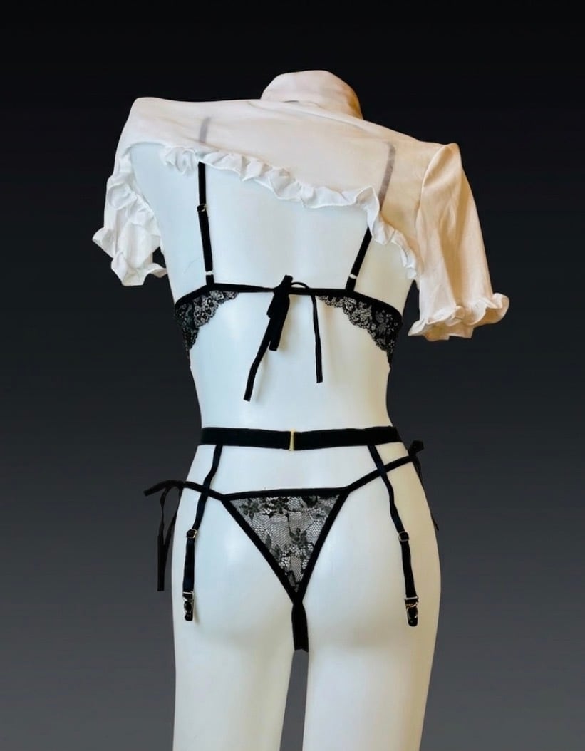 一見シンプルなモノトーンですが、繊細なレースの透け感と、フェイクレザーの重厚な光沢を組み合わせることで、奥行きのある「究極の美しさ」を表現しました。